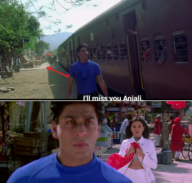 When Shahrukh was bidding Anjali goodbye in one scene, he was standing way ahead of the platform but later, he was standing on the platform with Tina behind him.